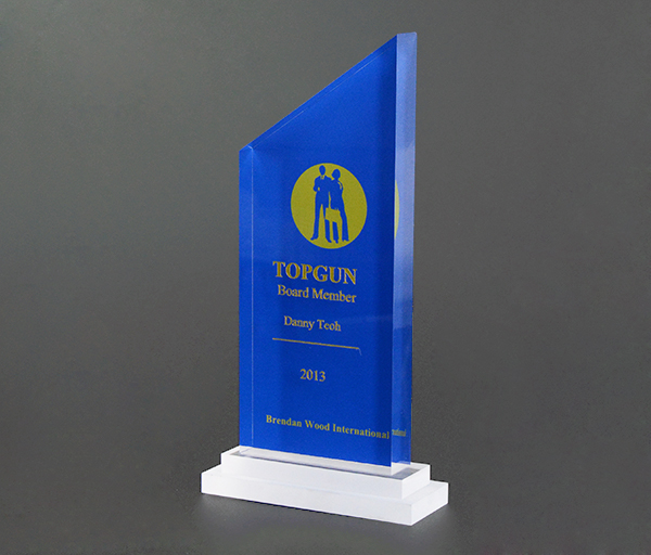 這款亞克力獎杯采用磨砂亞克力和透明亞克力兩種亞克力通過切割、雕刻、填色、粘接、絲印等工藝制作而成。中間的字采用雕刻填金色來制作更顯質(zhì)感和高檔。