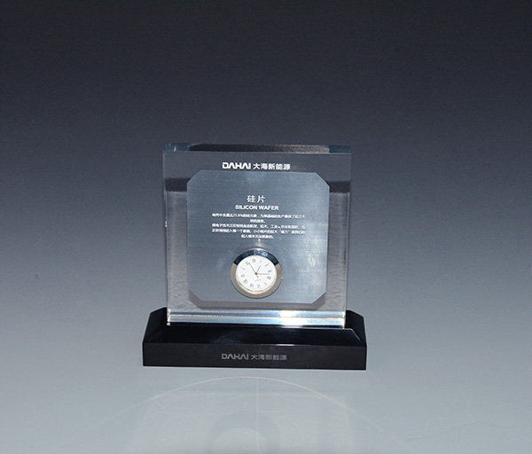 這款水晶膠工藝品上半部分由一塊水晶膠內(nèi)嵌硅片文字加鑲嵌一塊表,底座由黑色亞克力切割雕刻而成。整體大方直觀,可做收藏展示作用.