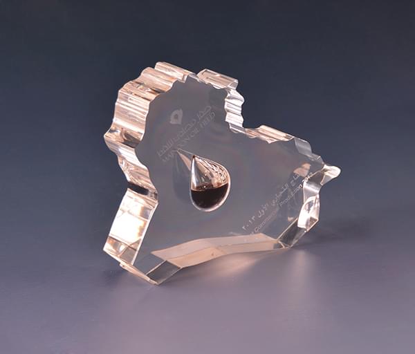 產(chǎn)品外形為客戶專業(yè)定制,表面鐳射公司logo與產(chǎn)品信息.內(nèi)部的油膽是石油公司開采的第一滴原油,為做留念,將產(chǎn)品置入水晶膠內(nèi),可永久留念.